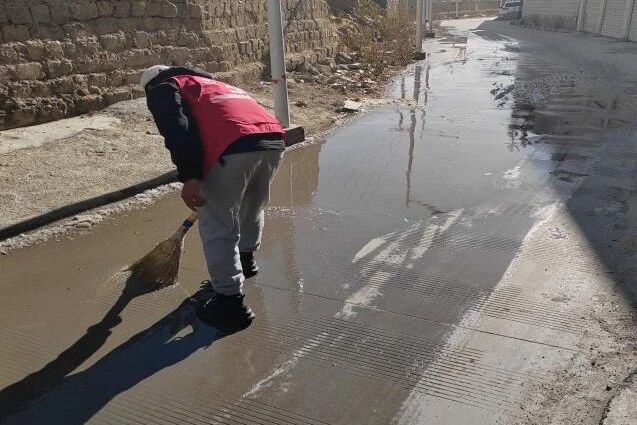 其间,社区网格员一边引导村民绕行,一边使用铁锹、撬棍等工具疏通下水道、铲除积冰。经过三小时连续作业,管道恢复通畅,路面结冰全面清除,道路恢复正常通行。