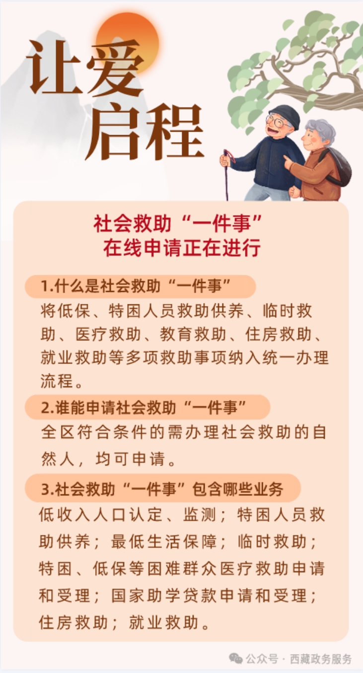 为进一步提升社会救助服务的便捷性与响应效率,让惠民政策更好直达民心、精准落地,西藏自治区“社会救助一件事”政务服务正式上线运行。