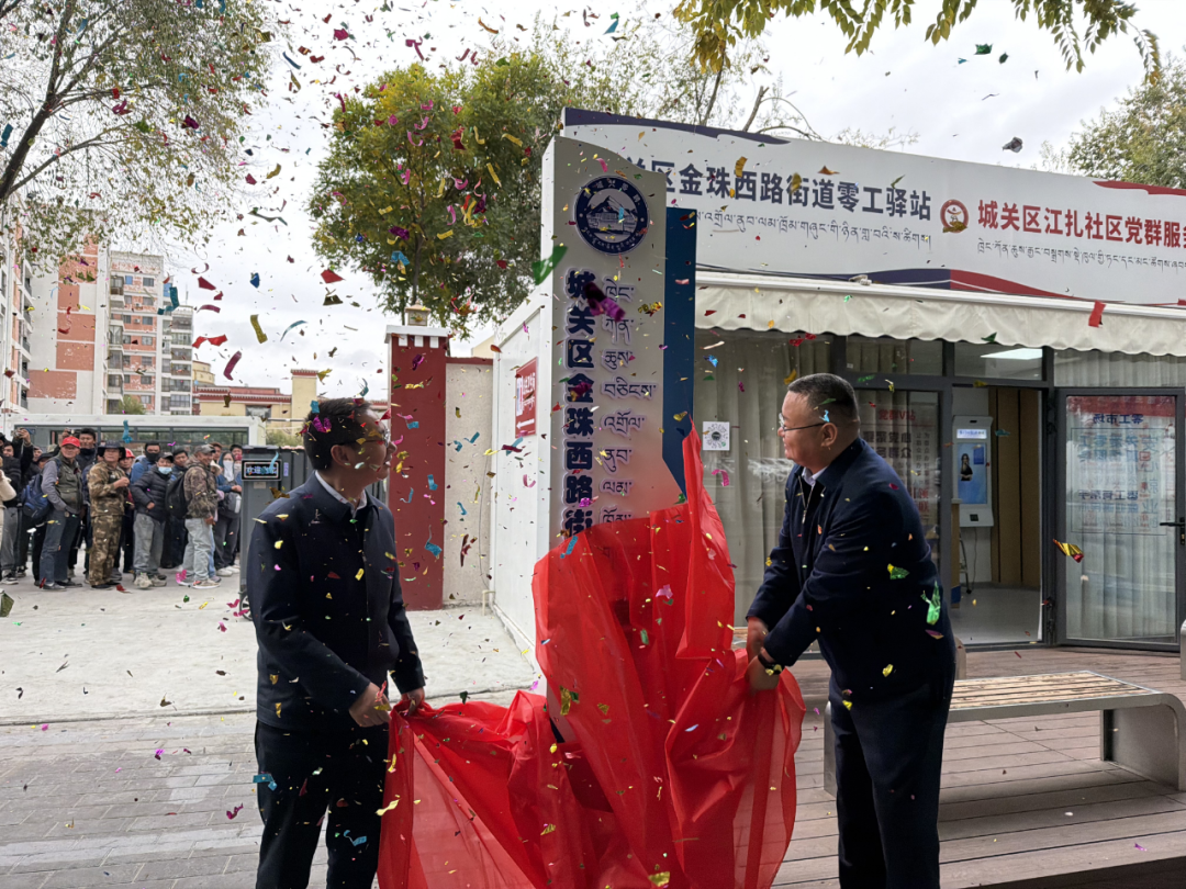 西藏自治区人力资源和社会保障厅党组成员、副厅长陈可玉,拉萨市委组织部副部长、人社局党组书记王满春,城关区委副书记、区长旦增曲扎,城关区委常委、政府副区长蔡丰出席,共同为“金珠西路街道零工驿站”“金珠西路‘家门口’就业驿站”揭牌并合影留念。城关区委组织部副部长、人社局局长王静主持仪式。